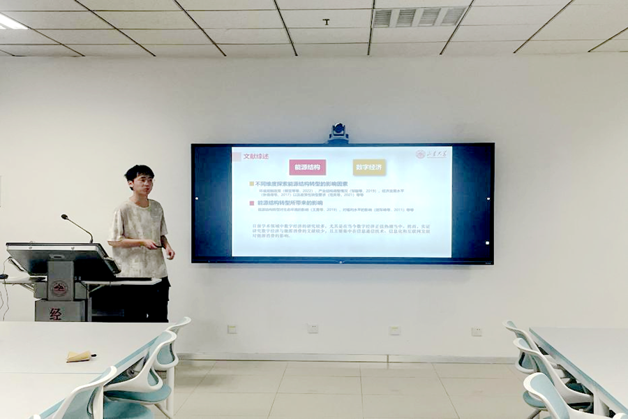 李天宇以《数字经济发展与能源结构双重更替——基于静态面板、动态面板和空间面板的视角》为题,通过理论分析和实证检验,探讨了数字经济发展促进能源结构转型升级的效应及其背后的机制,从数字产业化、产业数字化与区域协同发展等角度得出若干结论与政策性分析。点评老师从计量方法与论文展示等方面提出了意见建议。