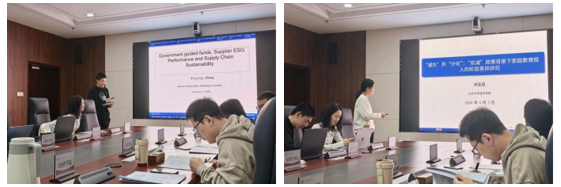 研文会上,薛暮桥班宋佳凝以《路通人兴:交通基础设施与中国家庭消费提振》为题,深入剖析了交通基础设施对中国家庭消费的影响与内在逻辑,通过多维度的实证考察,为社会民生高质量发展提供了经验证据。薛暮桥班张子阳围绕《政府引导基金、被投企业供应商ESG表现与供应链可持续发展》,把握可持续供应链背景,聚焦政府引导基金对被投企业供应商ESG表现的影响路径,为可持续供应链建设过程中有为政府的因势利导作用提供了思路。PPE班谢盈盈汇报题为《“减负”到“分化”:“双减”政策背景下家庭教育投入的阶层差异研究》的论文,聚焦“双减”政策对不同家庭教育投入的差异化影响,揭示政策在减负之外的结果,为理解政策冲击下的教育公平问题提供了新的经验论证。